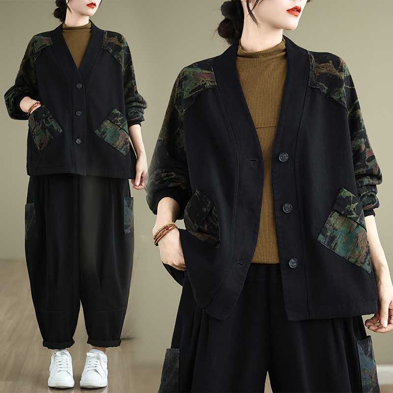 Hot!!!「ファットガール」 2024秋新品 デニムドッキング 上下セット ニットカーディガン テーパードパンツ 大きいサイズ 体型カバー レディース セットアップ メガ割